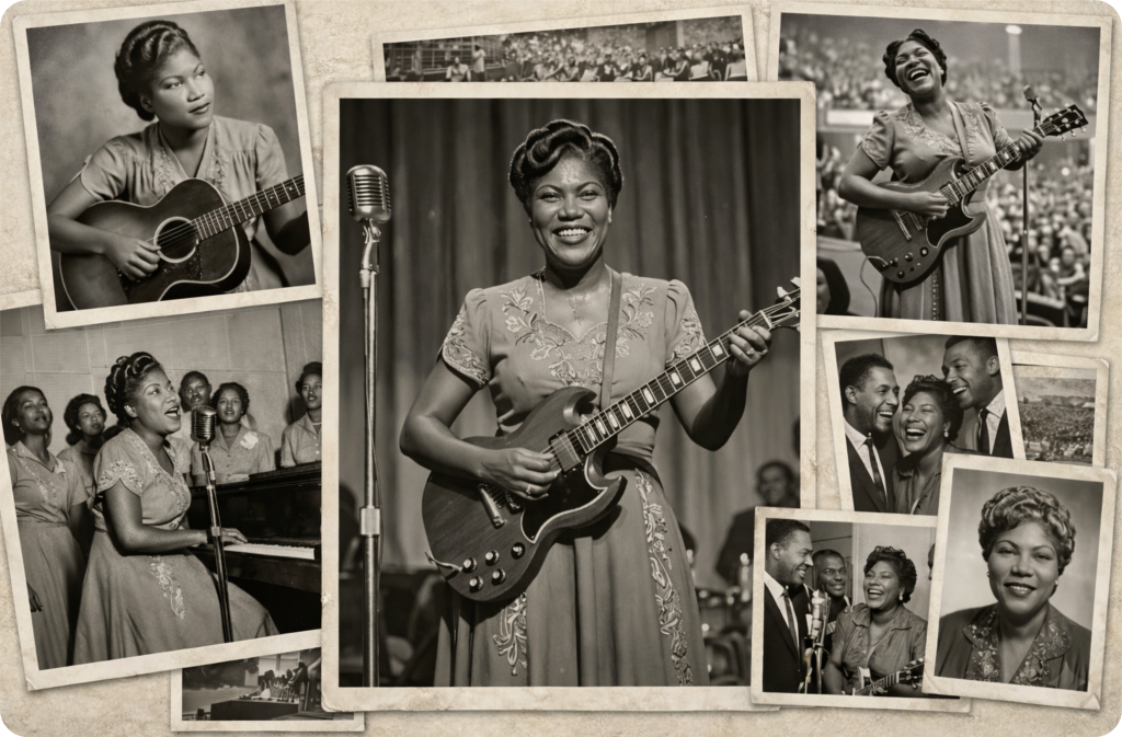 Quando se fala na origem do Rock n’ Roll, muitos nomes aparecem imediatamente: Elvis Presley, Chuck Berry, Little Richard. No entanto, décadas antes da explosão do Rock nos anos 1950, uma mulher já misturava gospel, blues, ritmo acelerado e guitarra elétrica de uma forma que antecipava tudo o que viria depois.